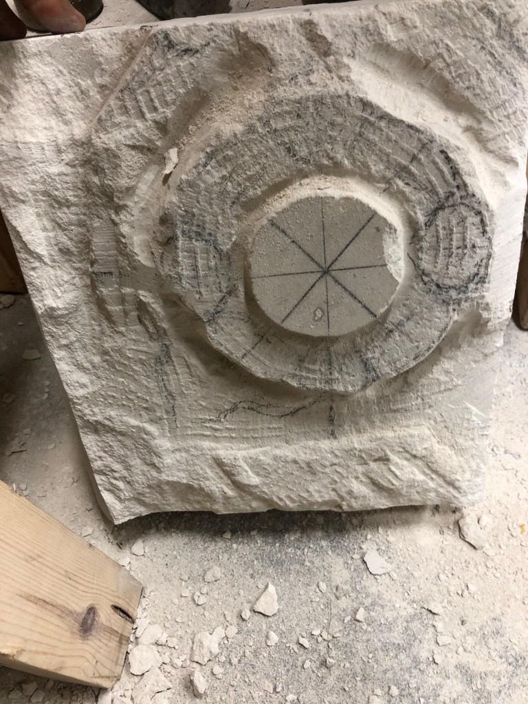 2nd day back, started by drawing the undulating leaf I was copying from a small waste mould I was given, I will have to change what I can see on the mould as its very uneven and rough. After spending the morning drawing I began wasting the stone and getting the levels in, by the end of the day I had started the first layer of undulations from the centre.