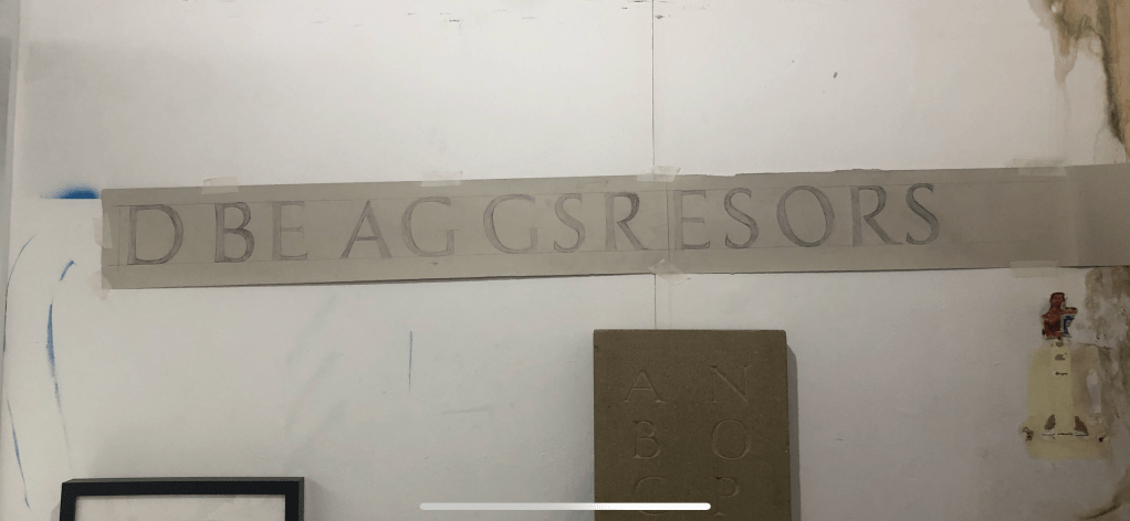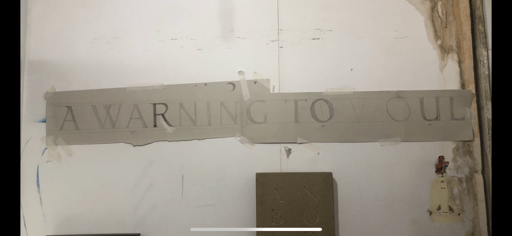 In studio drawing out inscription for ‘Fate of the Guilty’, 1st draft done, needs lots of work with both spacing and letterforms. The ‘o’ shape is far too tilted compared to the ‘G’ so need to adjust them and the spacing is all over the place. Will correct in 2nd draft this week. The letters I originally drew out need to be changed to match the style I have decided on now, this shouldn’t take long though.