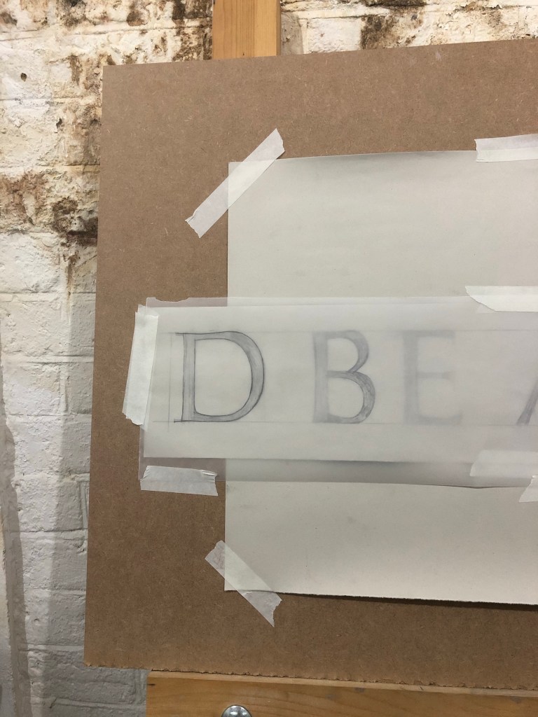 At my studio I continued with the lettering for my ‘Fate of the Guilty’ show. Went slow again but only had an hour in the studio in the end so guess I did as much as I could, also carved half a letter for the lead.