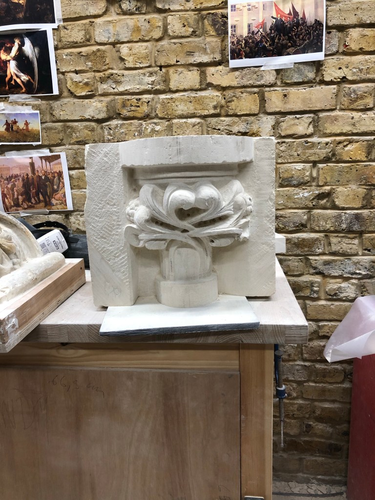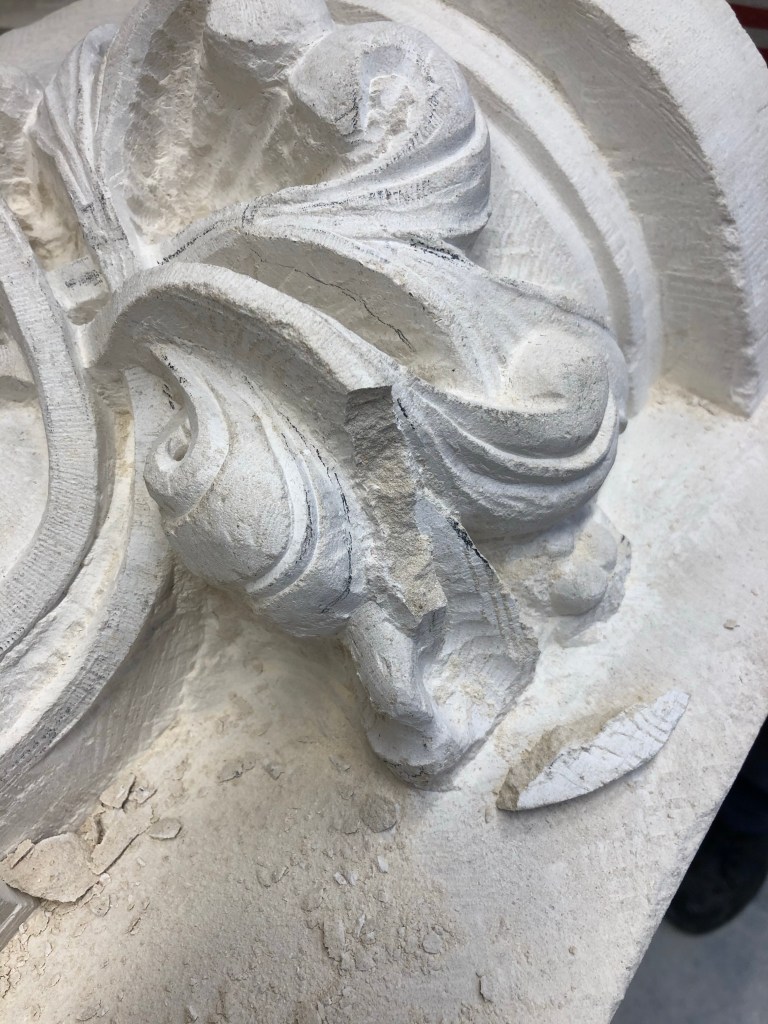 Top left of the cap, in my rush to start carving, I copied the restored section which left the masonry curve far too much compared to the plaster.