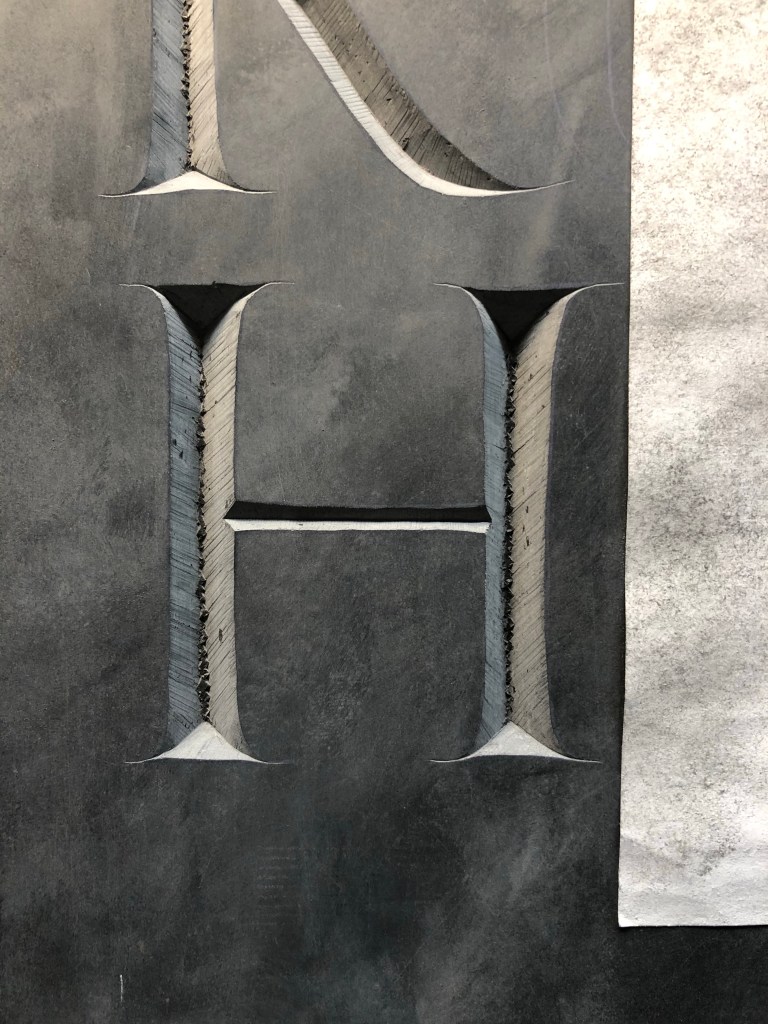 Using reference images for the transcription project to protect the transfer while I carve. Wanted to start with the big letters so I have more room to correct mistakes rather than start on the small letters which will only need one pass to finish them.