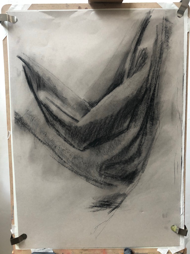 I need to be freer while applying the dark of the compressed charcoal. I took my glasses off to help with this and seemed to work, didn’t go into too much detail. Helped me find ‘principle movements’.