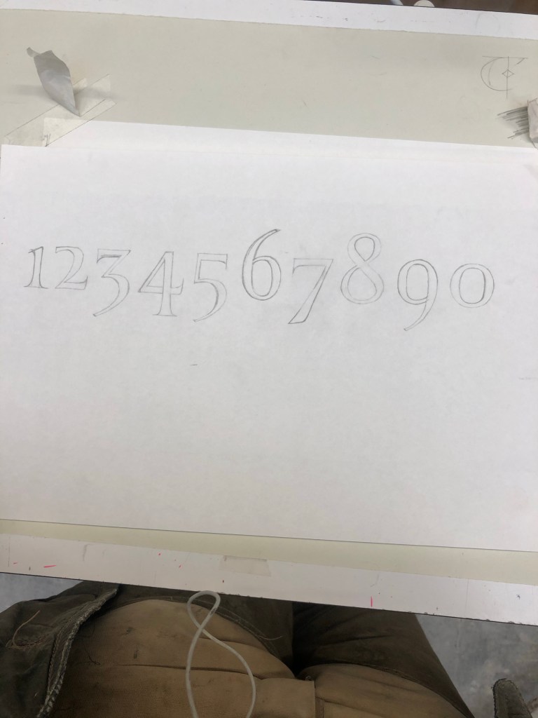 Continuing from last time we started on non ranging numerals. Worked very fast to get the first draft done, has helped me immensely by pushing myself to be quicker. Letters now flow together and feel freer. Tom notes this set of numerals are much less high contrast which is something I have a tendency to do. Far too thick with skinny thins. Goes back to what Ieuan told me about using my eyes rather than blindly applying ‘rules’ I’ve been taught.