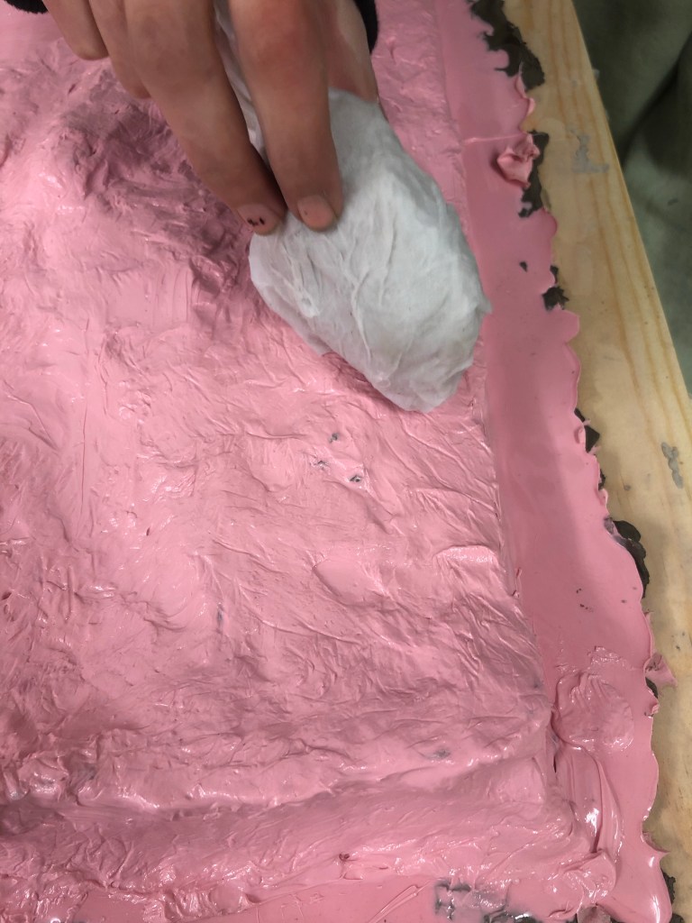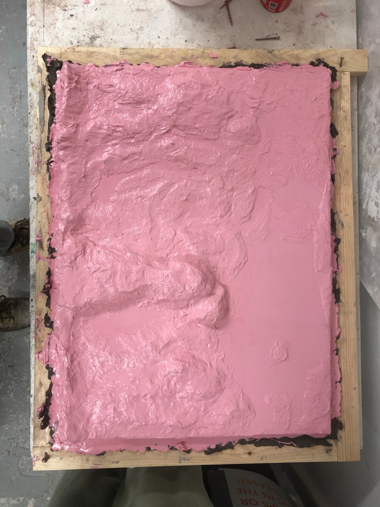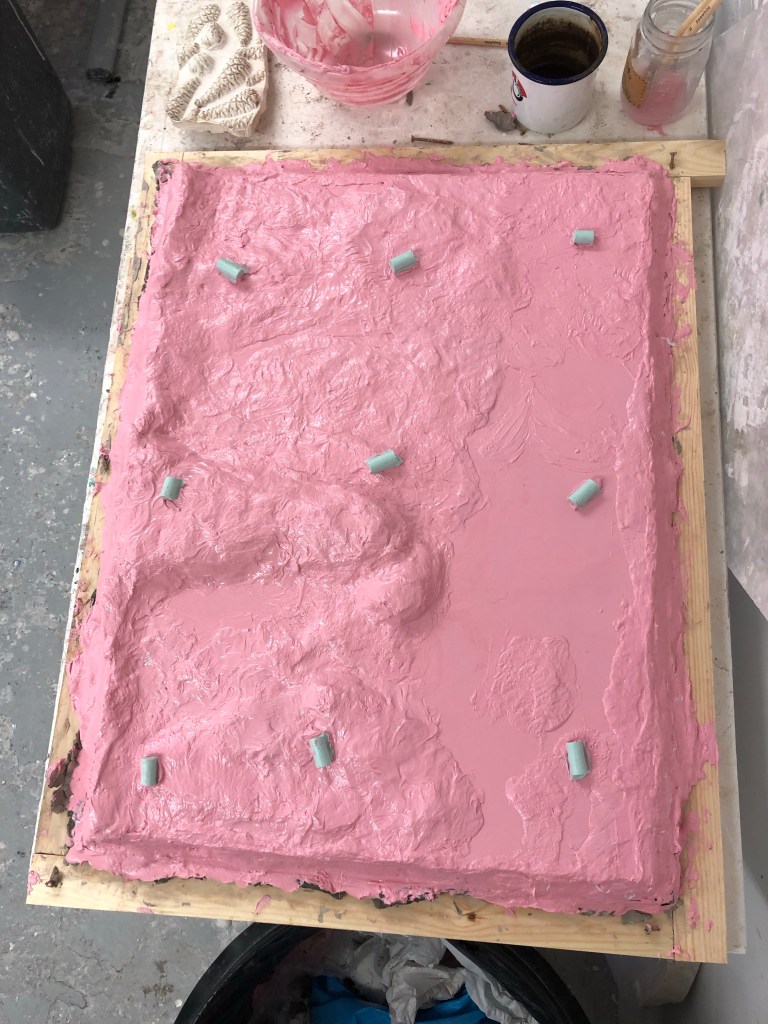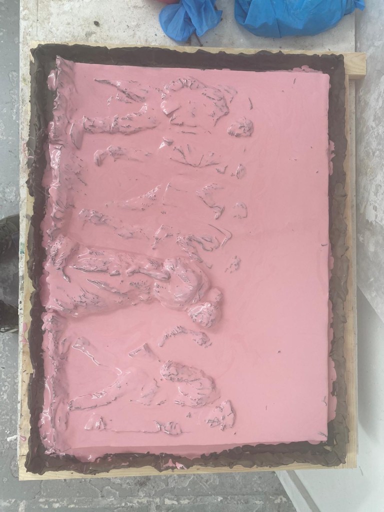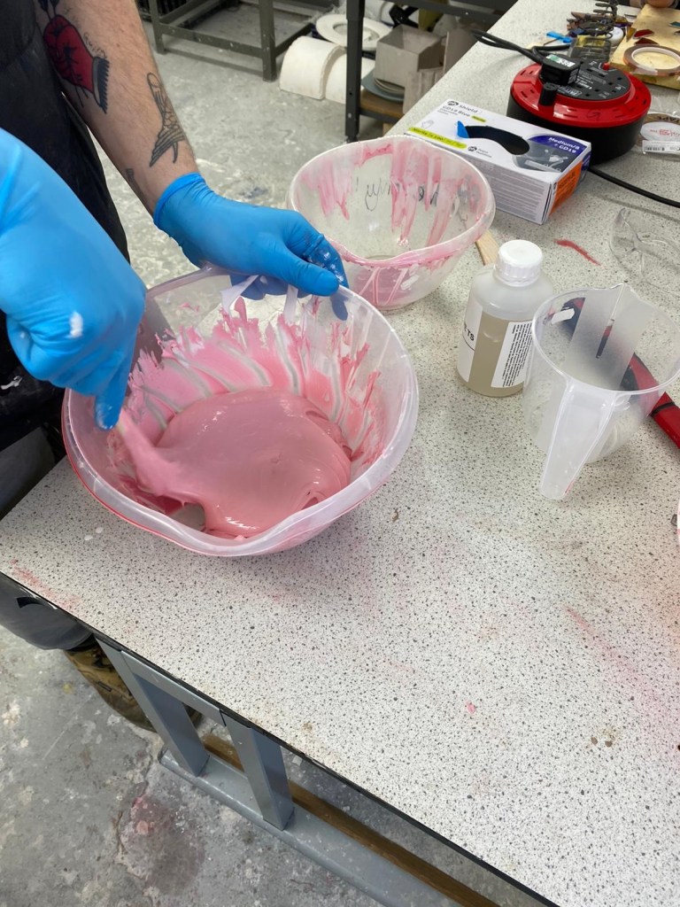 The next day, after the silicon had fully dried, we started on the jesmonite backing, this was a fairly simple process of pouring the jesmonite directly on the silicon and making sure it was well coated before laying down the jesmonite-scrim between the layers. After 3 layers it was completed and we waited for it to dry before doing a plaster cast.