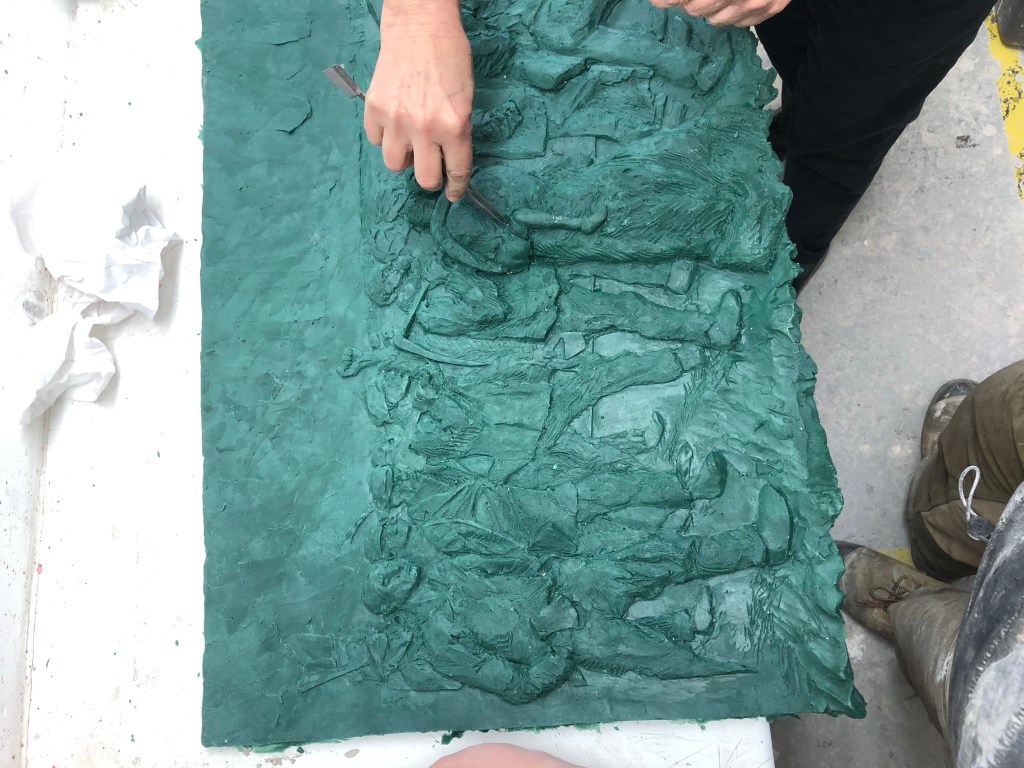 We started with a thin coat of the silicon (10-1 of silicon and fast acting catalyst) and pouring this on the clay from around a foot to prevent air bubbles.