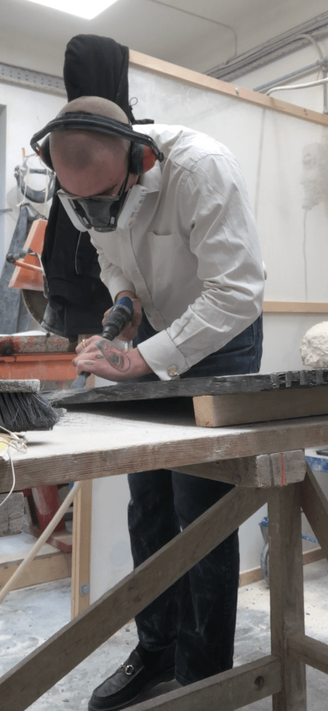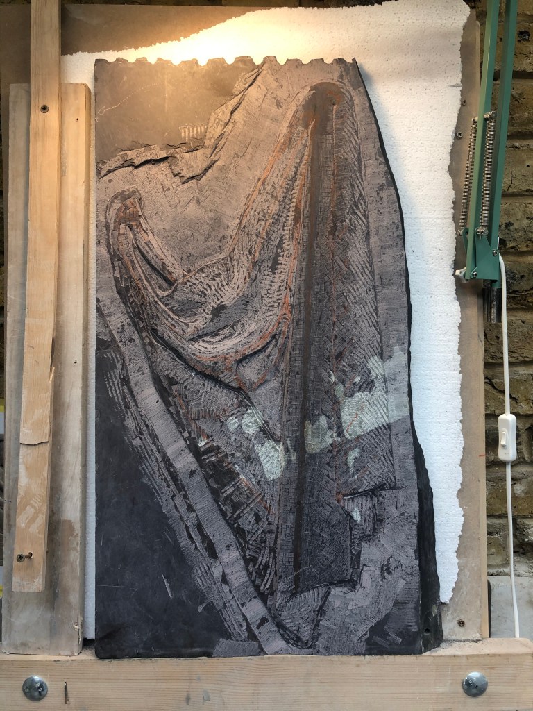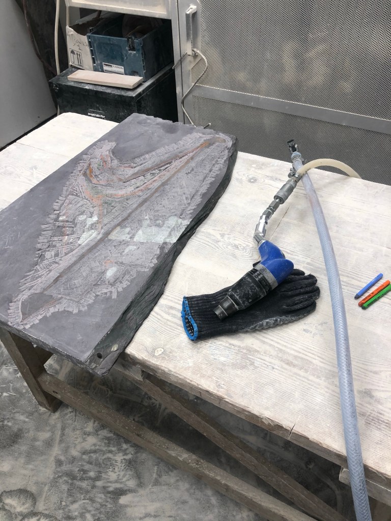 Anyway, I started in the cutting room on the air tools for my slate, definitely made the job easier. Got a lot wasted and worked on the edges and depths, less then actual volumes as the air tools would have plucked too much stone on the actual carving.