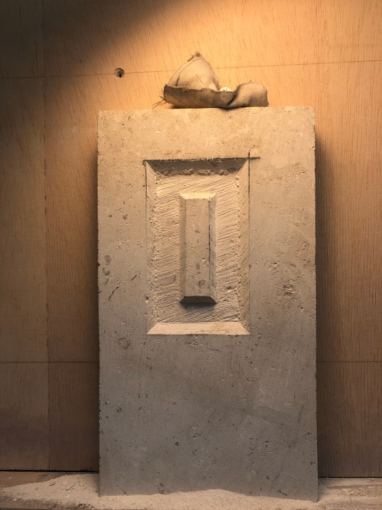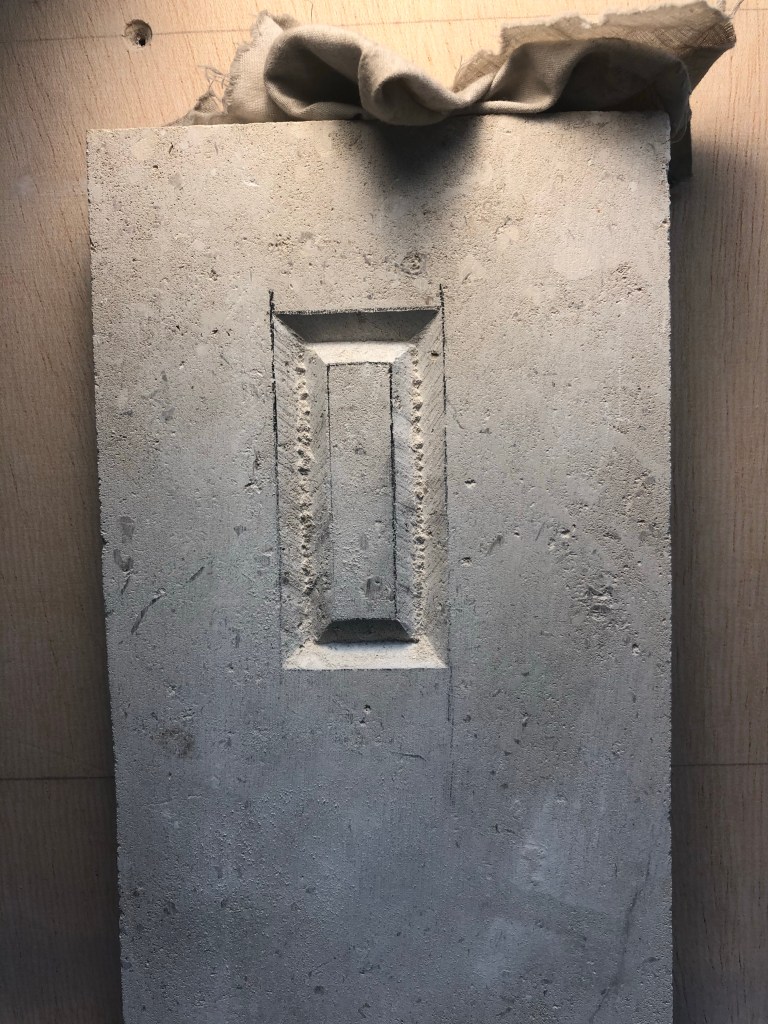 We started by drawing an ‘I’ shape directly on the stone to learn the technique of carving a raised letter. It’s far more important to get the correct angle (45 degrees) of the chisel when cutting the outer shape as this determines the depth. make sure to leave 1/2 a mm outside the letter so you can come back and cut the final angle of the letter when you’re finished getting the depth in.