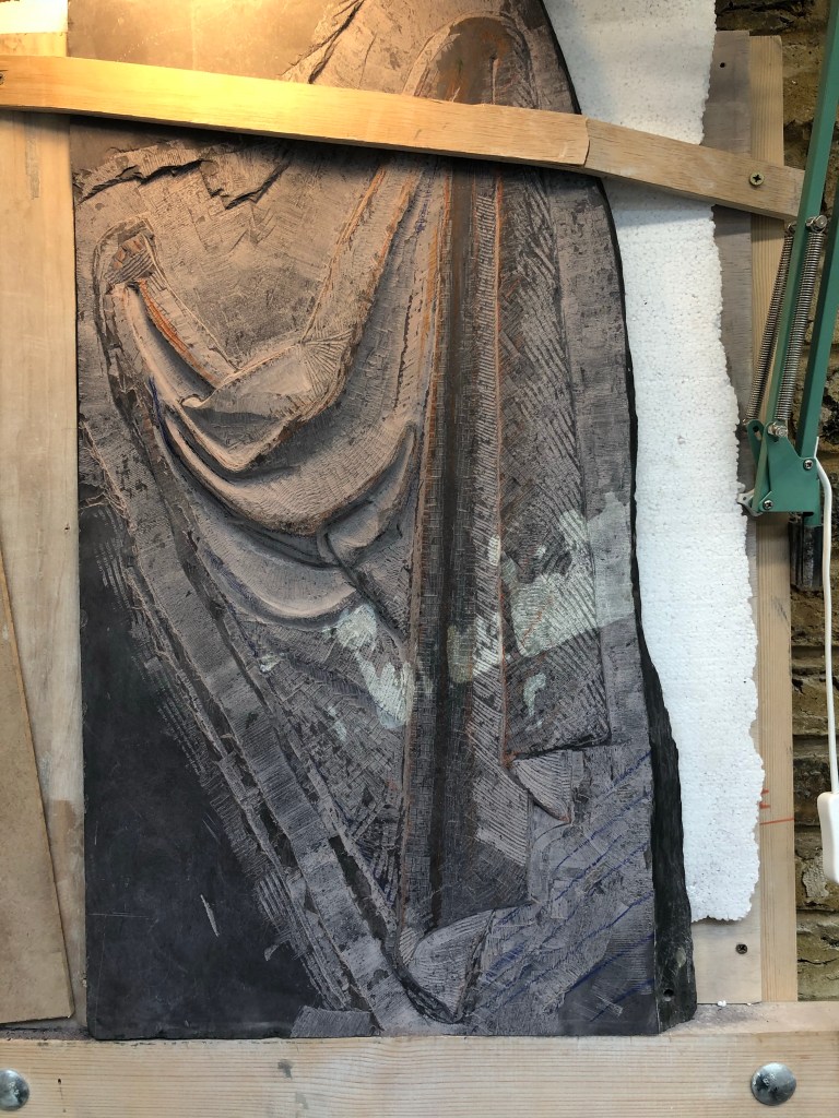Carving was good in the cutting room today, got the background roughed in, added undulation to the pipes on the right and steepened curves to give the drapery more movement. Which is hard in low relief. Getting more confident with the air tool, will probably get the trigger one as I’m not sure I prefer the set up of the one that’s constantly on.