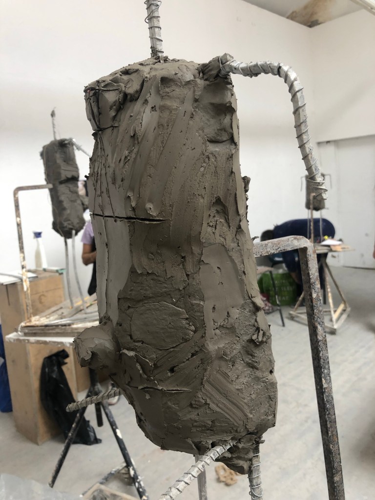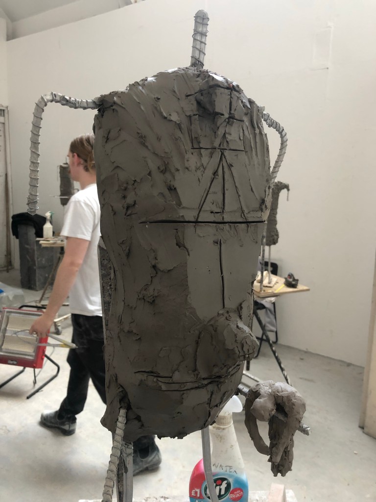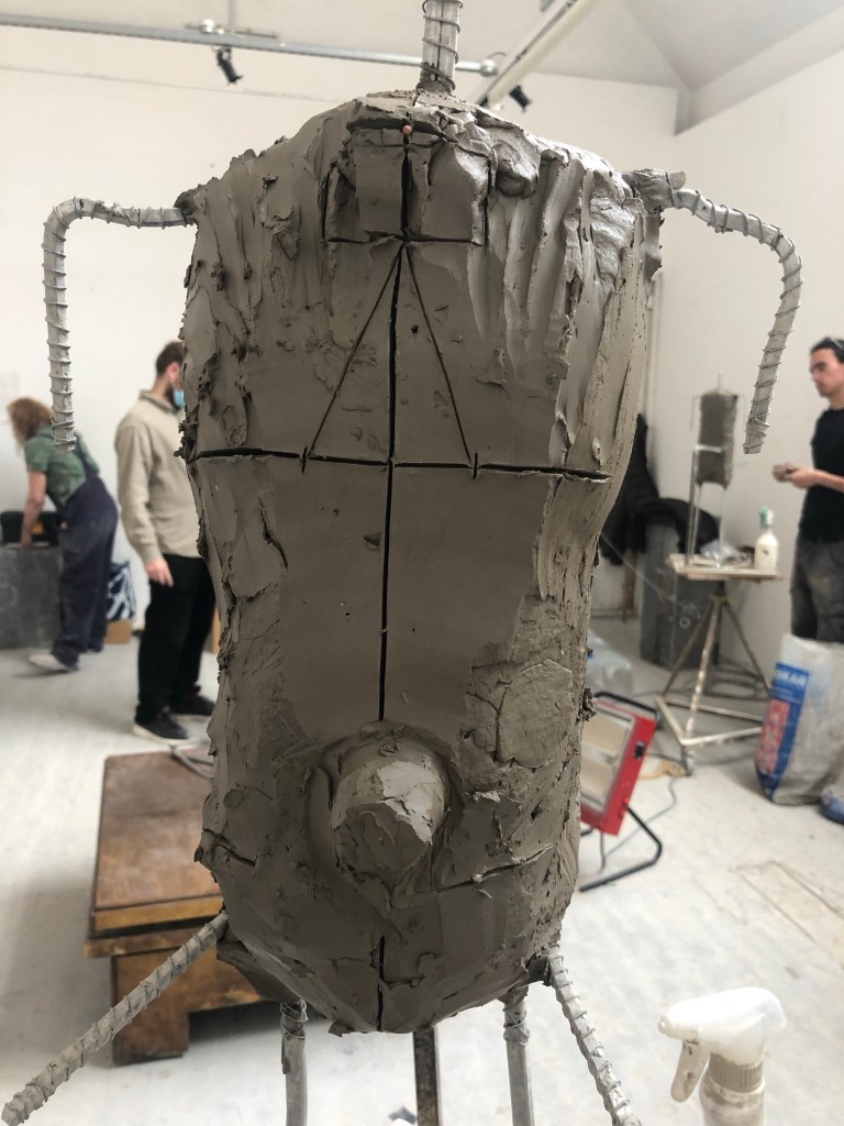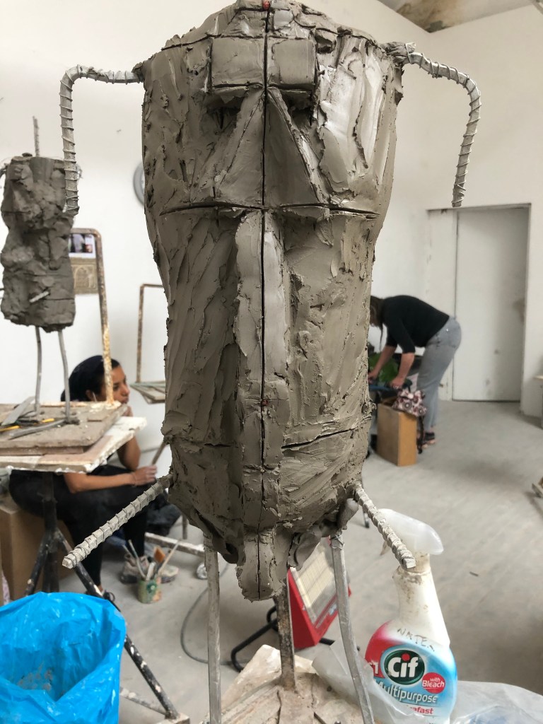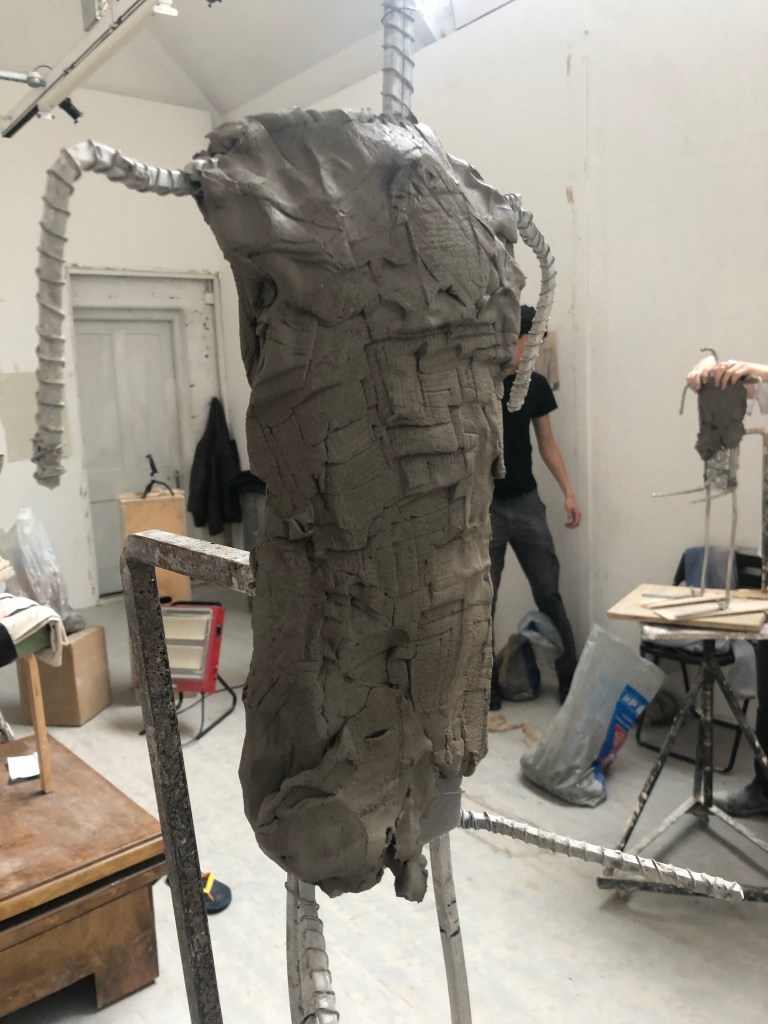 We started by covering the armature with a layer of clay, smacking on with a stick to make sure it was compacted. Making sure not to be too heavy too soon. The first point we found was the sternum notch, marking this on with a match so it doesn’t change throughout.