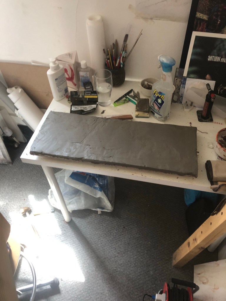 Set up back board, attaching chicken wire and plastic, and laid the bed of clay. Used Emma’s technique of rolling clay out between two bits of wood to get a perfectly flat and level background.