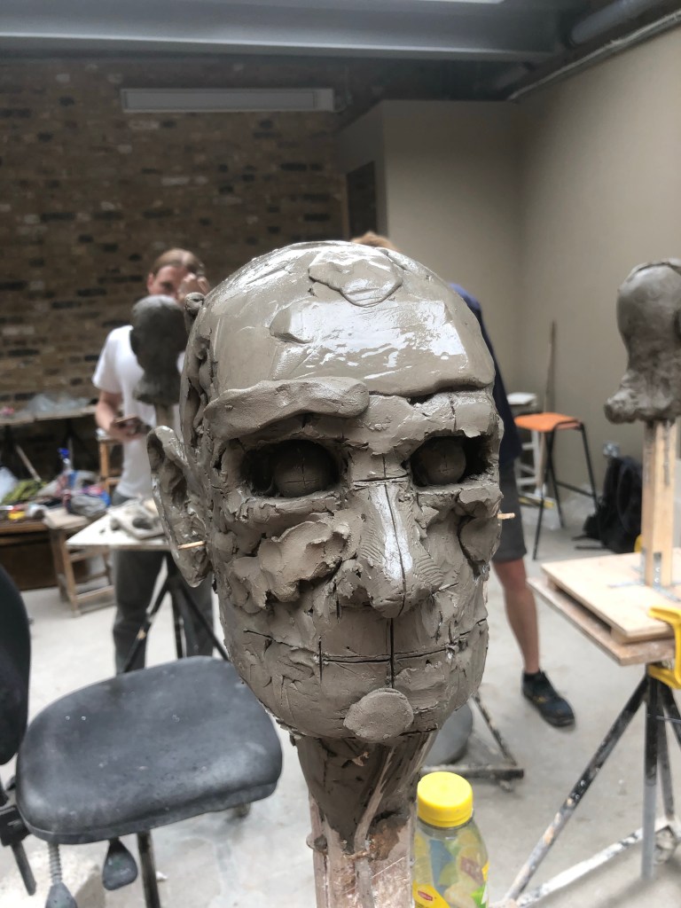 Started work on the eyes themselves, after checking all the measurements. Rolled up a twenty six millimetre ball of clay, slightly smaller than the actual eyeball so it will fit in the cutout sockets. Then worked on positioning the eyes by cutting out and reintroducing clay until everything lined up.