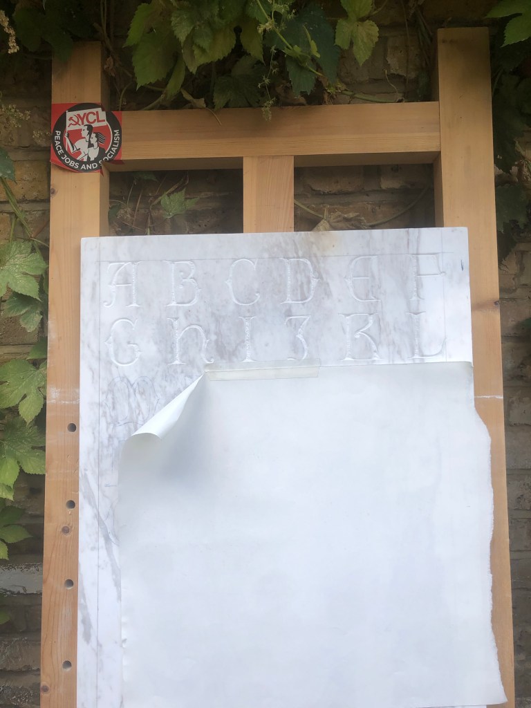 Finished the alphabet and transferred it onto the stone by 12:30. Started cutting at 14:45. Had to finish early due to a meeting. Cut from A to L.