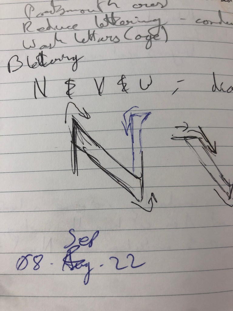 Spoke to Bailey (artist commissioning ‘Jack’ inscription. Letters need to be slightly reduced and the spacing closed up. Will try to age the letters too. The cross is to be replaced by the Portsmouth’s Coat of Arms.