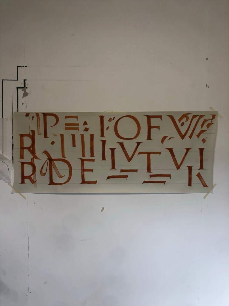 Finally moved onto large Trajan with a one inch brush, using the proper technique of holding the end of the brush, standing back from the paper. Much easier to twist and get the serifs/junctions right, but keeping weight of the tip and getting a clean stroke was very difficult. This technique requires a lot of work for me.