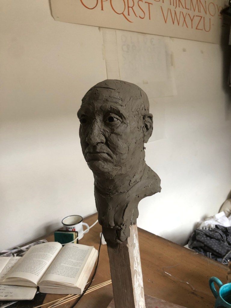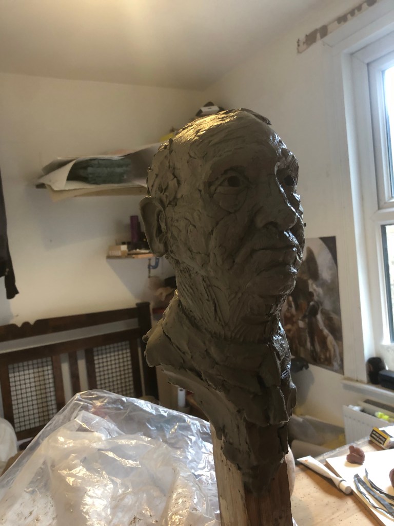 After lunch I moved onto the eyes and head. I think the eyes are in the right place. However, his actual head is on the small side so got rid of the rough hair and added some clay to the forehead and skull.