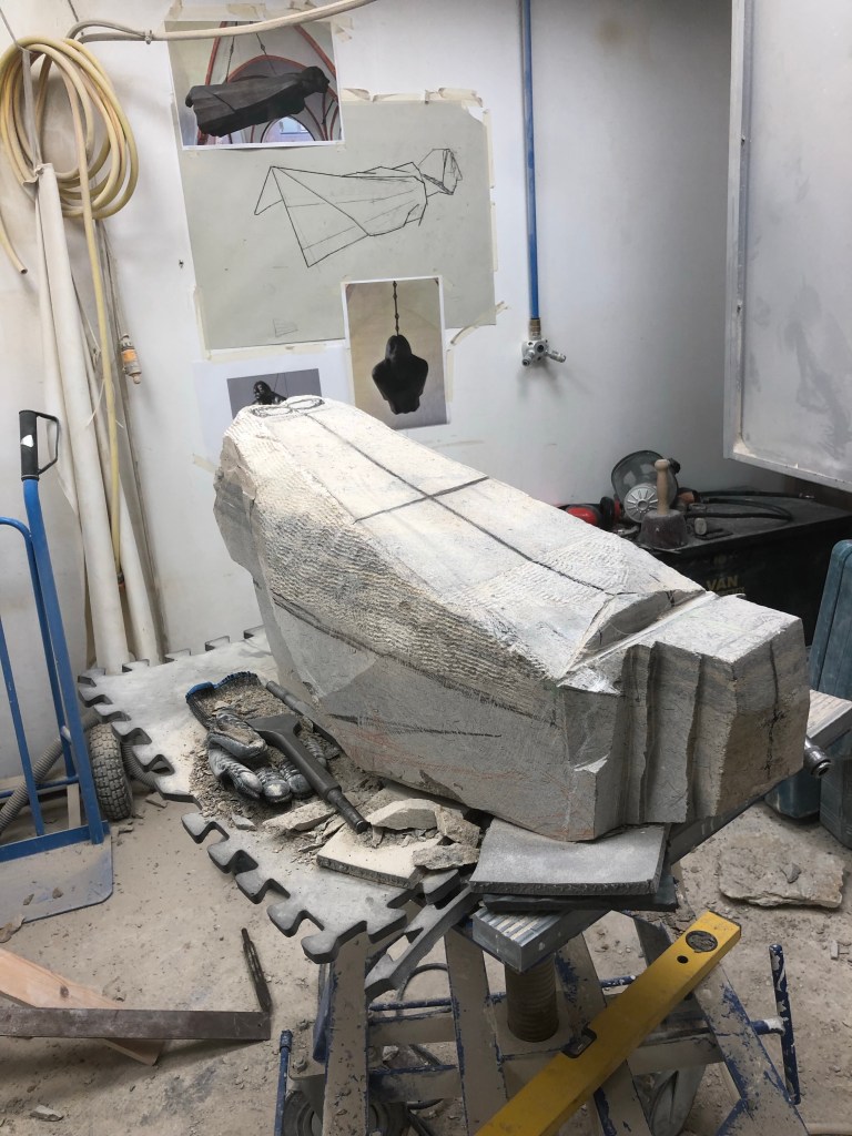 Fairly good day all in all. Not working hard enough mind. Mostly used air tools to start roughing out drapery, pushed some of the top planes. Worried I went too far as I spaced the folds further away from the front so now they may not be visible when the final piece hangs. Will check tomorrow.