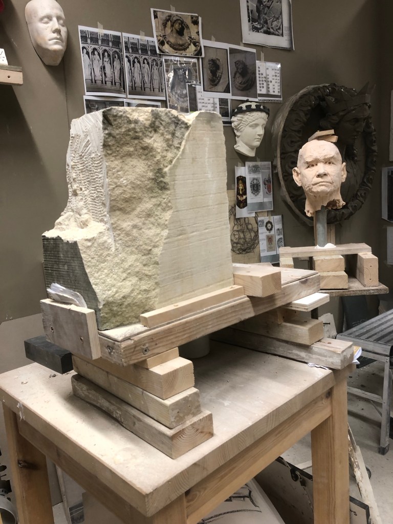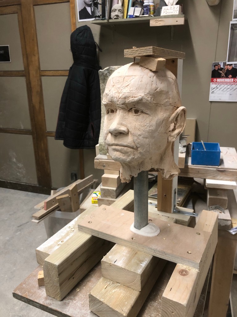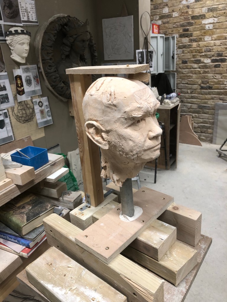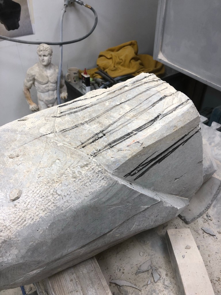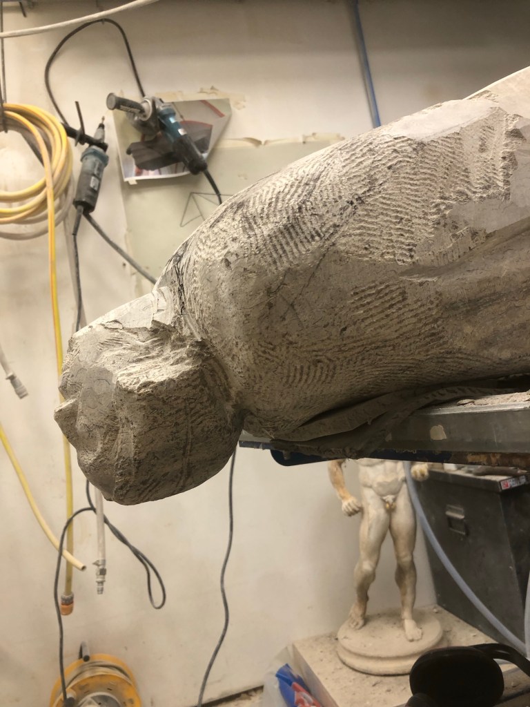 Moving round the whole figure lots, shoulders, underside, drapery planes and feet. Good chat with Nina. Said I should focus on the shoulders still and get these in perfectly, along with the sternum notch and the hollows in the shoulders. Treat the planes of drapery like masonry. The fullness of my figure is creating a fattened effect, instead it should look starved.