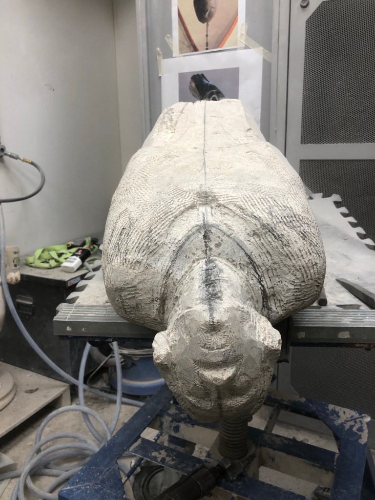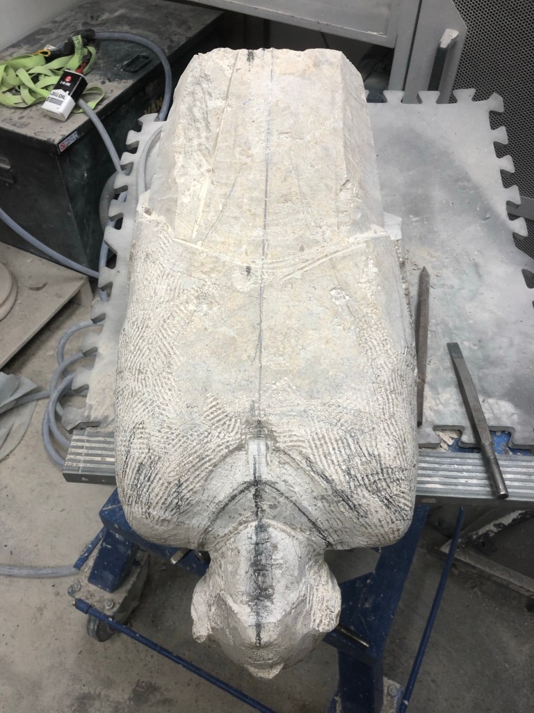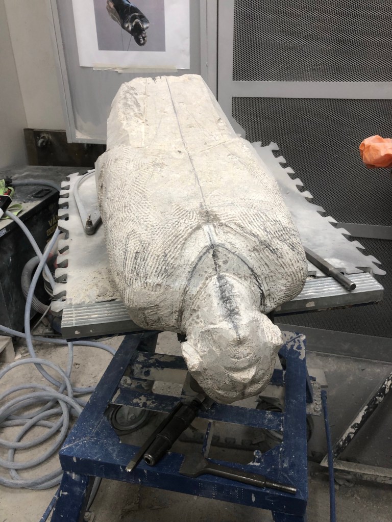Good carving. Defined sternum notch and collar. Moved down and carried on rounding shoulders. Is getting tough again though. Lots of thinking.