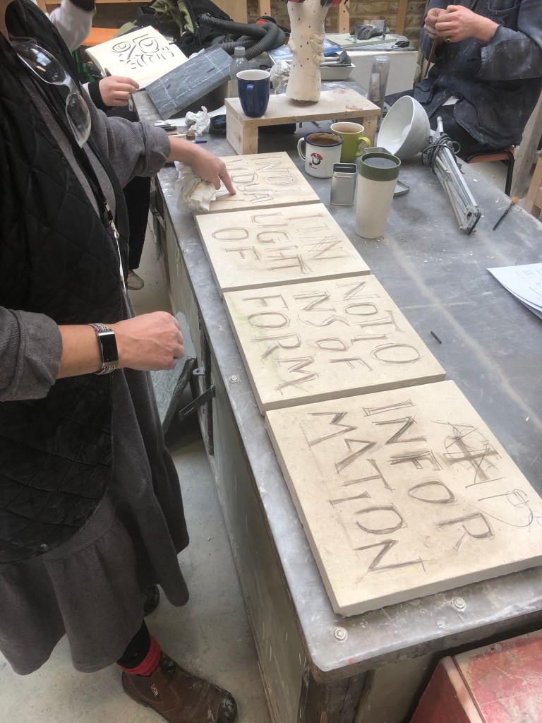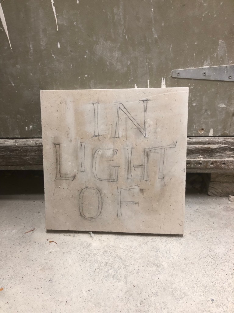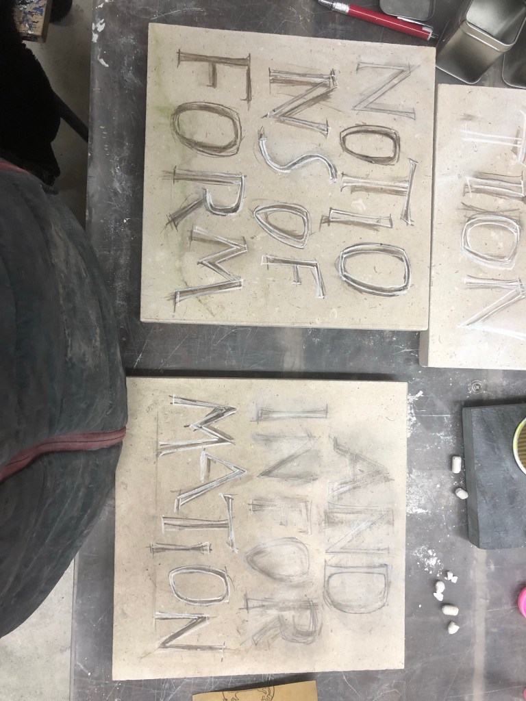 Spent the first portion of the day working on letterforms with white chalk before rubbing this back and reworking the spacing. From here I made most of the letters bigger to tighten up the negative space, although the letterforms were fine there were too many rivers running through the design. Spent the last couple of hours, once I was happy, using a fine pencil to refine the forms ready to carve.