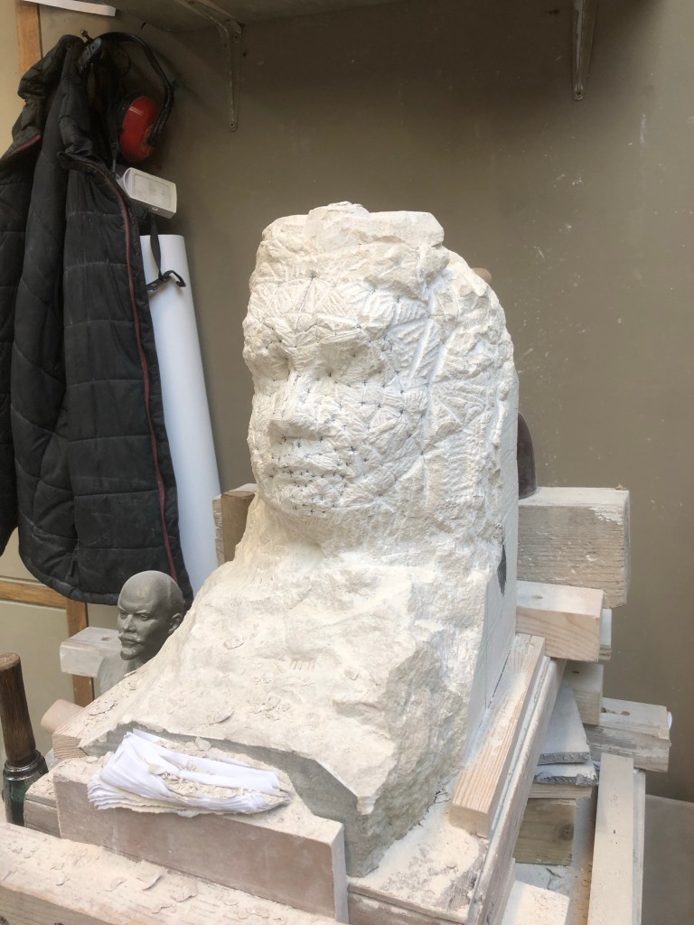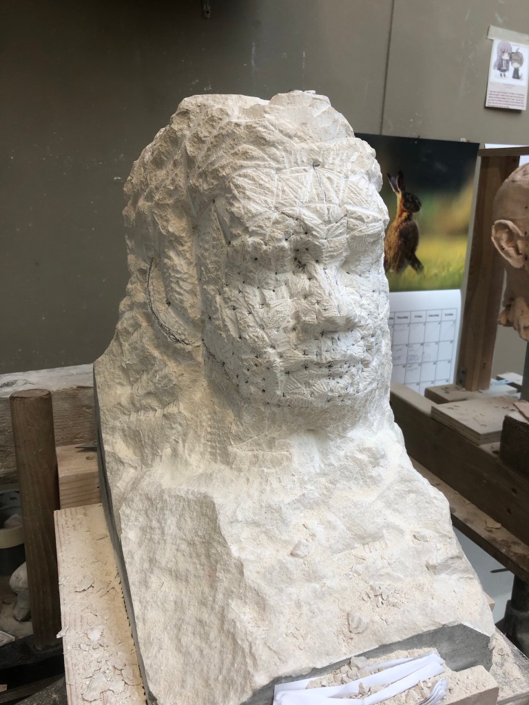 First full day on Phil, started by working in the eminences of the mouth, then worked up to the eminences of eyes. Having clear points to work to feels completely different to free carving, as I have been with the angel. From the eyes I moved onto obviously full areas which were distracting the eye. Working my way down to the jawline, trying to get a bit of shadow under the chin to help me see.