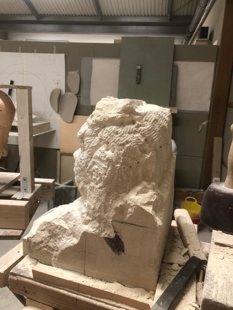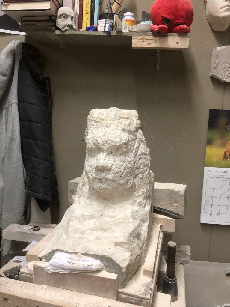 Got too caught up with detail in the bottom left area of the chin in the morning. A good start to the day but needed to move onto a different area to make sure the whole piece is evenly worked. Continued around the left hand side of the face, working the cheek and then towards the ear. By the end of the day I decided to move past the ear and onto the rear of the head, trying to get the general shape and size of the skull in so the stone looks more like a portrait. Tomorrow will work the right hand side to the same level and hopefully will have a much more portait looking piece.