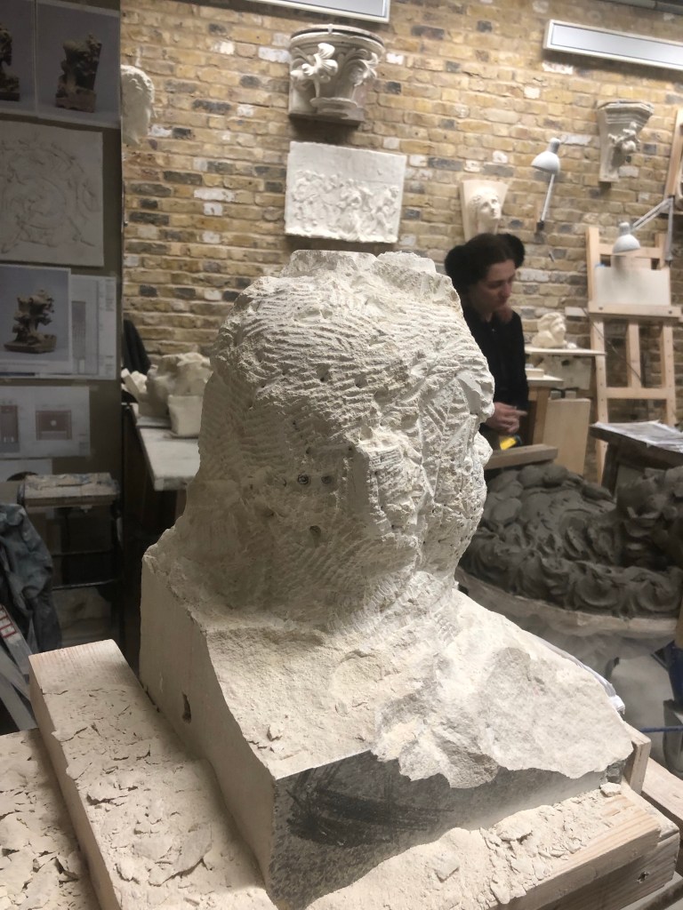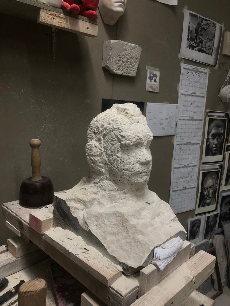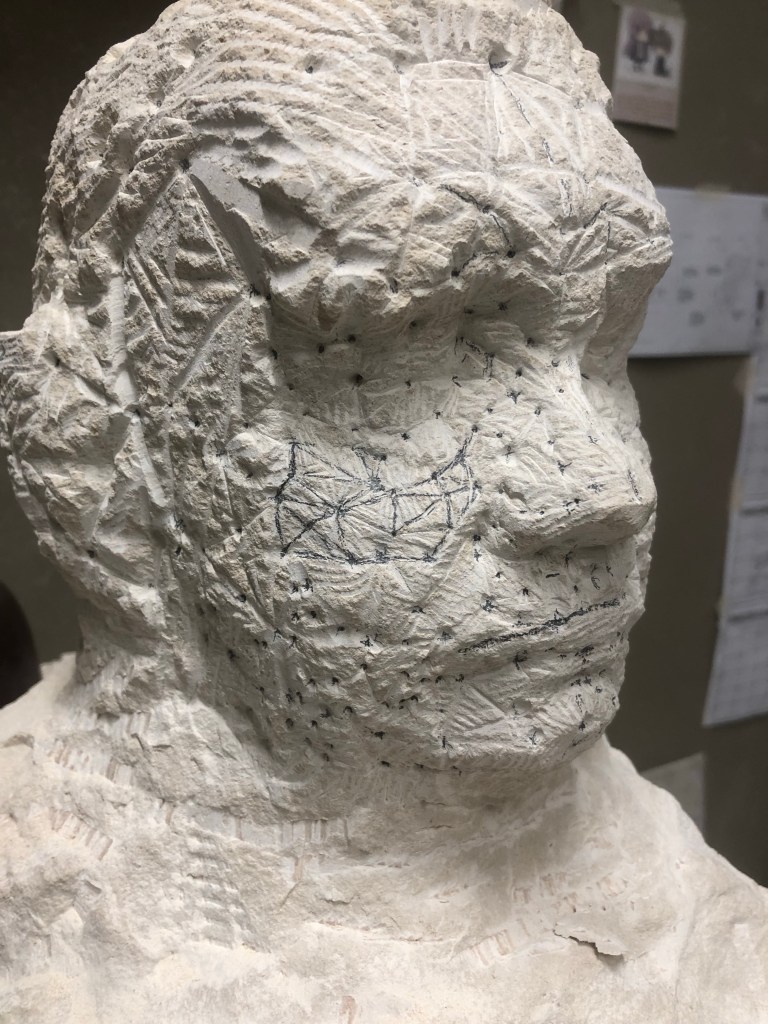 Decent amount done I think, feels like I’ve done well anyway. Started working the cheek and eye area without the pointing machine. Used a grid between points to help me see where I’m going and what’s happening in these different planes. Will try and work the entire face down before I continue this process though. End of the day I moved back onto the skull and wasted plenty away to help free up the portrait.