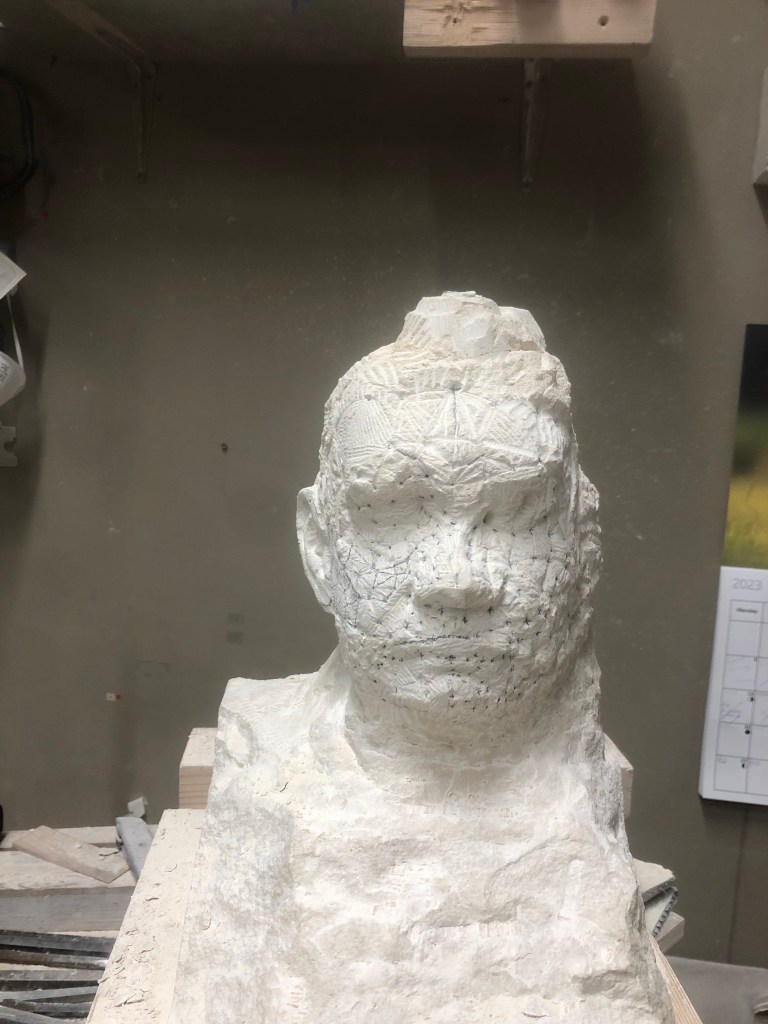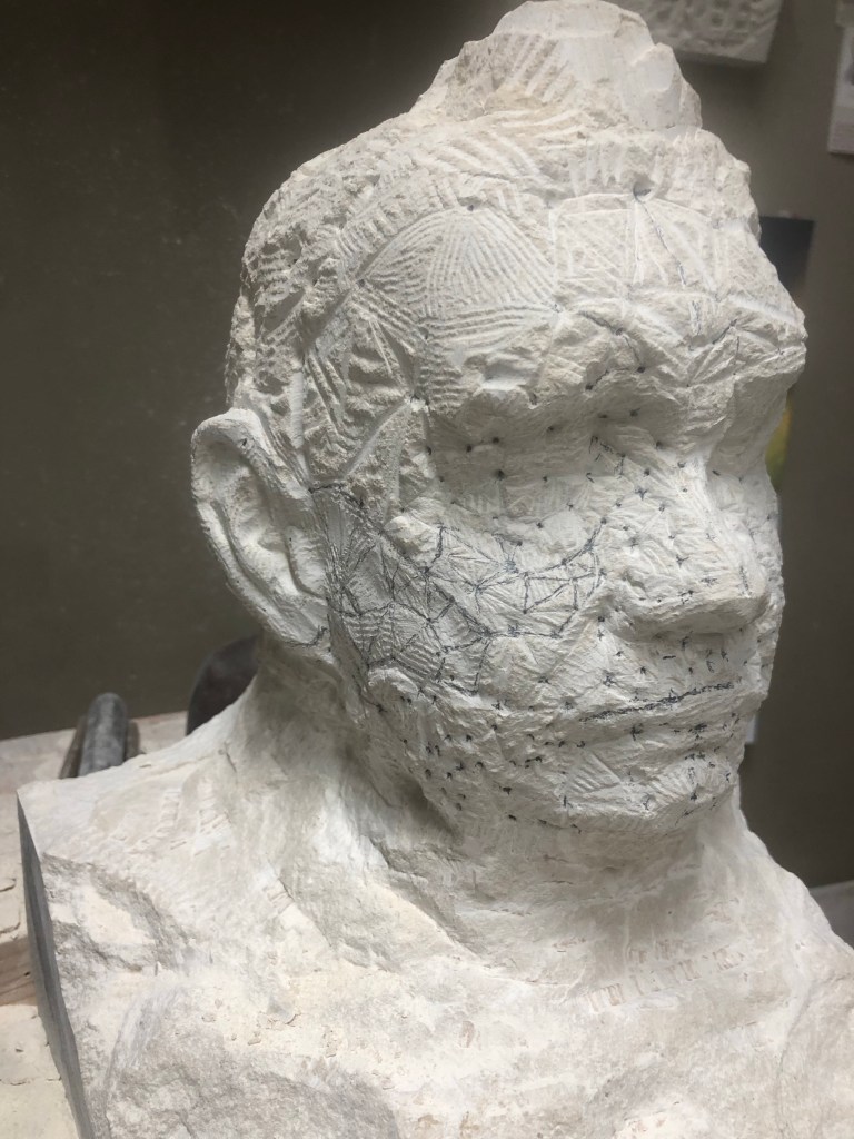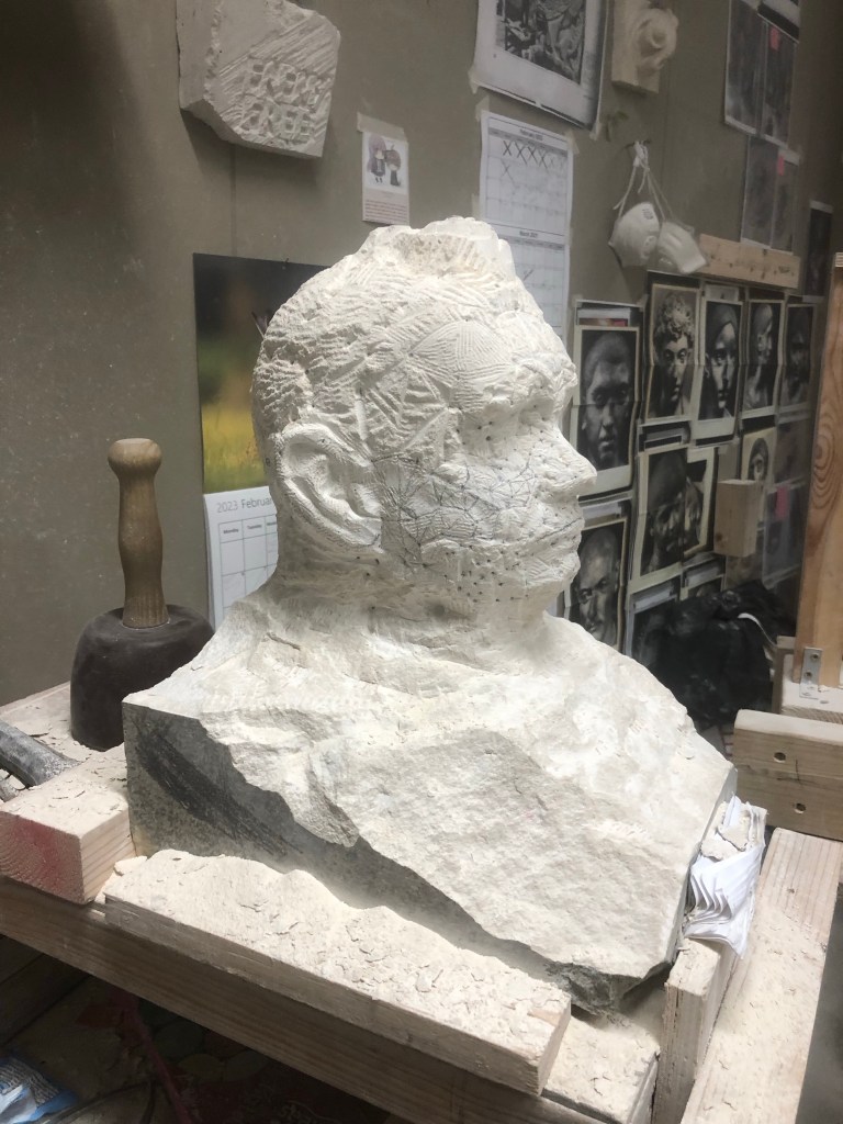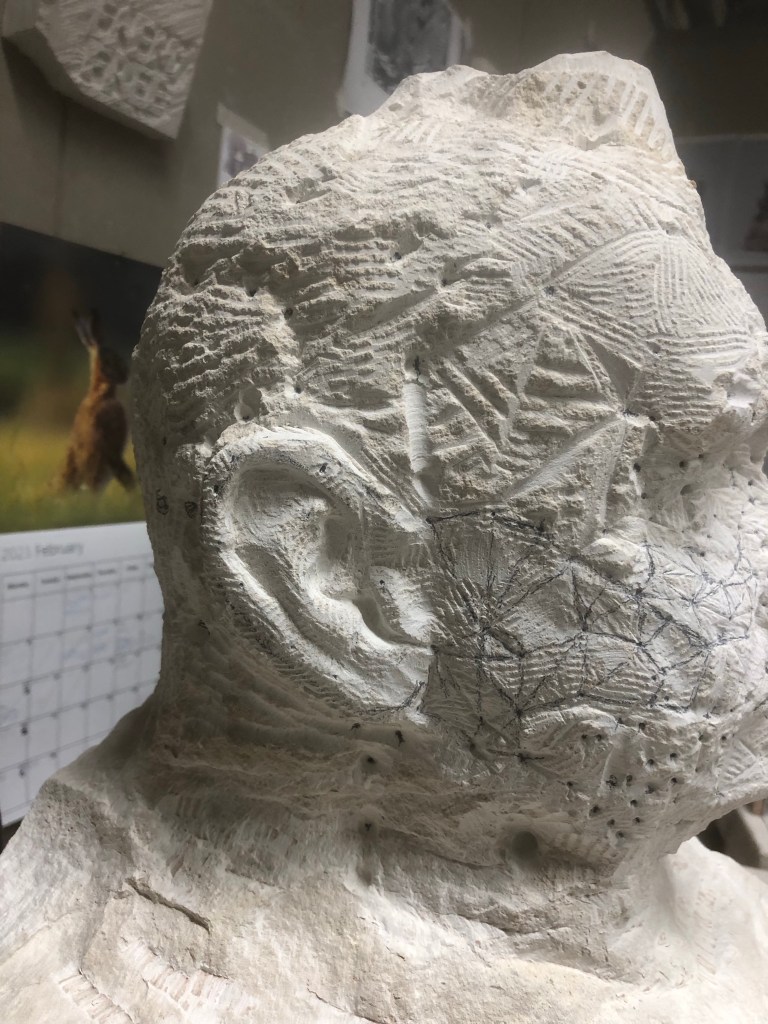 Started carving proper today. Spent the entire morning on the ear. Still too flat and full but good start. Moved onto the right-hand cheek after this, using the grid to guide me and focus on areas. The expanding this grid to move around the face and between points. After about 5:00pm moved onto more wasting, around the neck, to help slim the whole piece down. Just a few points before working roughly under the chin and ear.