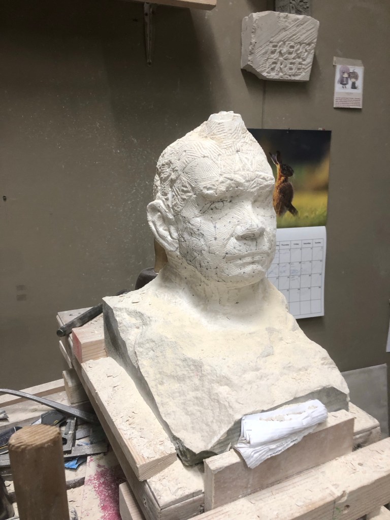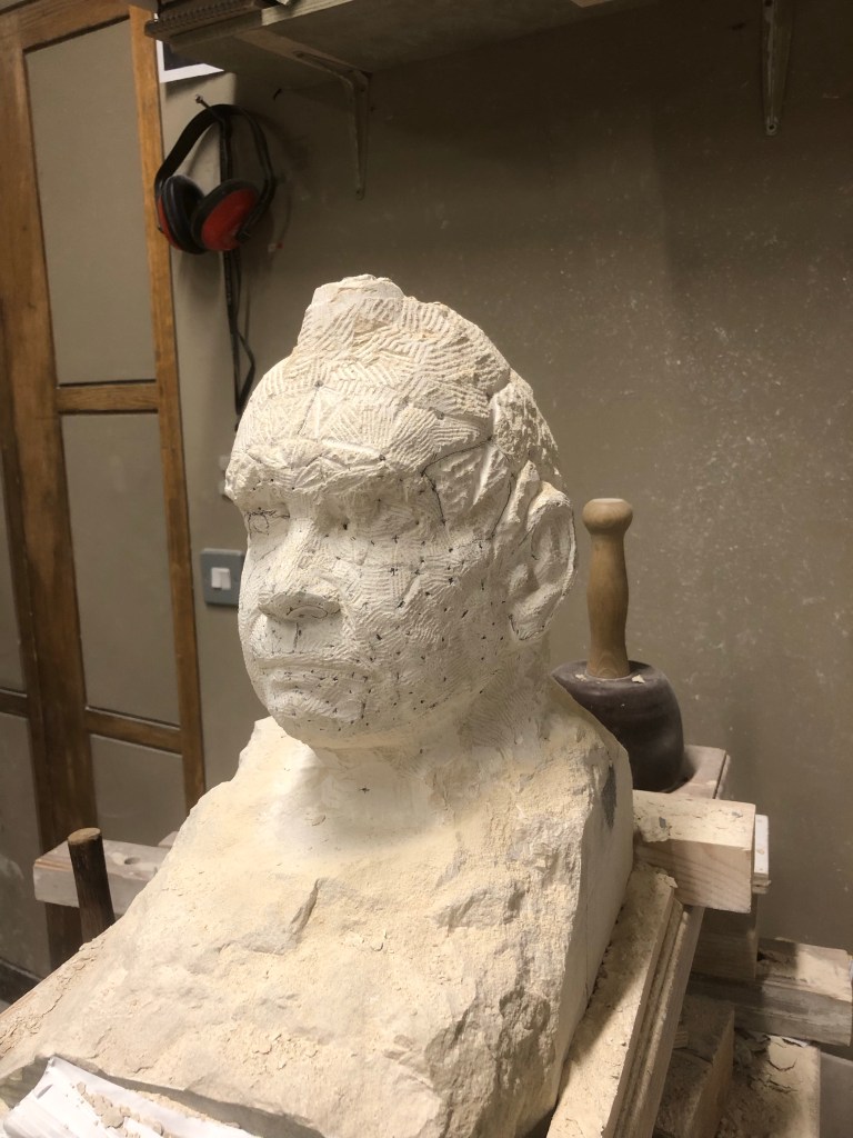 Continued carving generally, worked the cheeks brow before finally moving onto the head and neck, areas i had left full due to laziness or fear of breaking the stone. Overall good progress but wish I was faster, tomorrow I’ll focus on the eyes before assessing the entire portrait to see if I can remove the pointing machine.