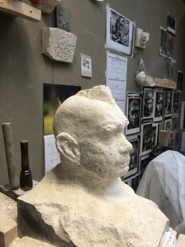 Spoke to Kim about how to display the portrait, she said think about cutting the stone from different angles, but keeping the roughness and the cut sides. Also spoke about eyelashes and the Royal Society of Portraiture. Always good talking with Kim. Will wait and see how I finish it.
