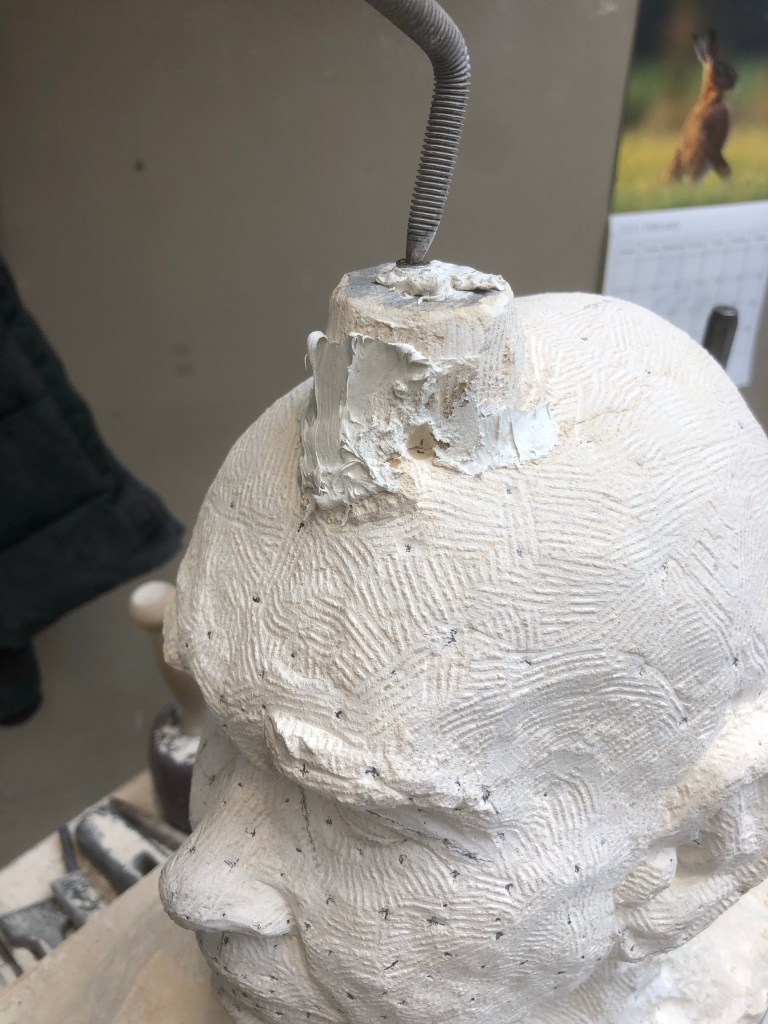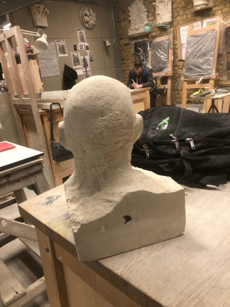 Finished Phil (to a degree) for the show with Kofi, hapoy but made a huge fuck up at the start which I discovered today. Drilled hole for pointing machine way too low so had to repair that once the top came off, luckily the fault didn’t break so didn’t have to deal with that too. Just put glue around the vault while I punched the neck and stone to blend the portrait into the block. Happy with how it looks, looking forward to getting more detail and refining the form.
