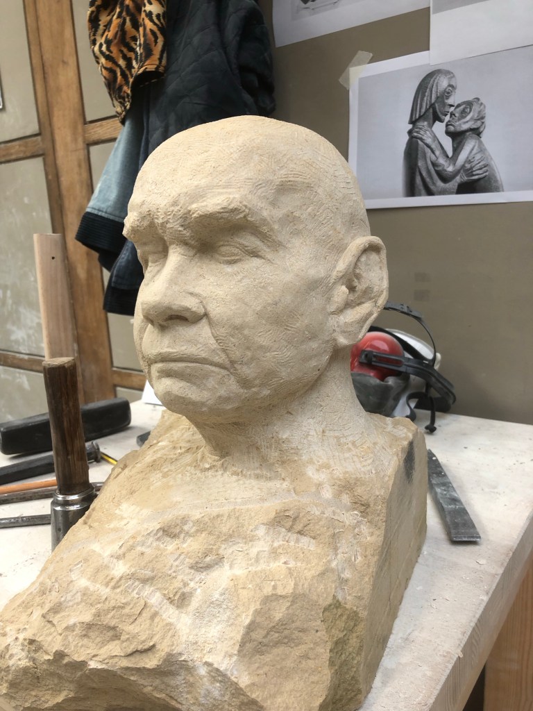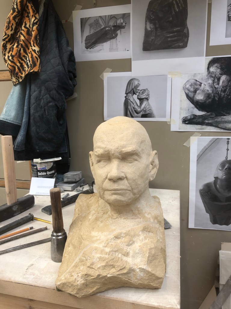 Continued on ears a little but mostly worked the eyes and brows. Will talk to tutors Monday but I think I’m finished. Will grind the base down and then make the neck work. Happy with progress. Will store this after the beginning of this week and come back at the end of the year.