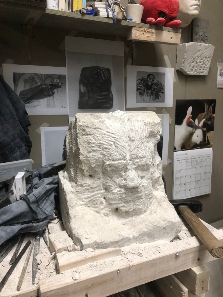 Continued roughing out very briefly, trying to be more methodical and carve the form while pointing. Rather than blindly go from point to point, drilling.